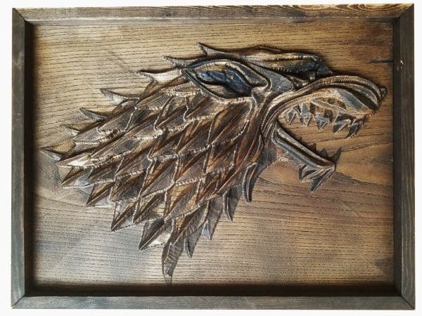 This beautiful carving of the House of Stark emblem is carved out of a single piece of hardwood and stained with espresso stain. This is my newest works and I’m excited to share it with you!