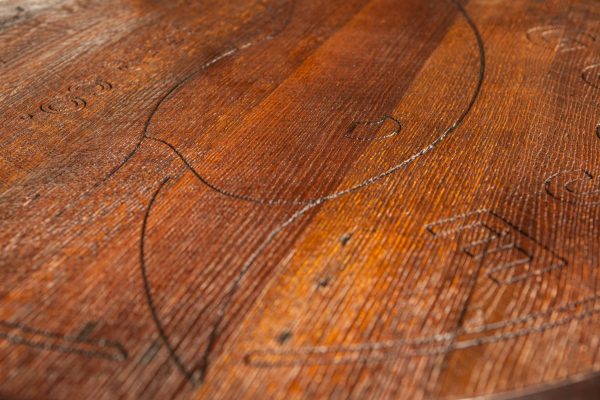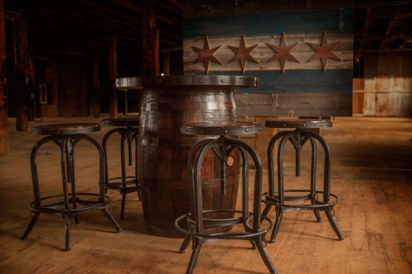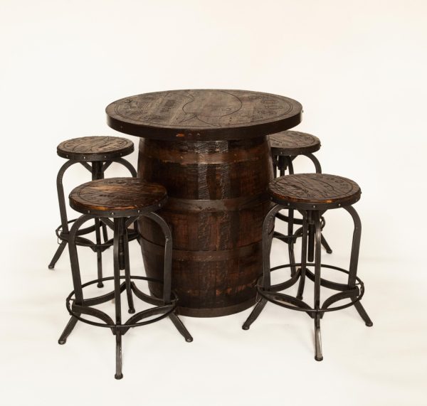 Reclaimed bourbon Barrel engraved personalized tables for your business or home with 4 matching stools. Table tops are made from 100 year old oak barn wood. Bases are either bourbon or wine barrels, your choice. Tops of tables and stools can be engraved with any logo or design. Shipping is available! Table Height 39″. Table top 36″ diameter Chairs adjustable from from 32.5 to 28″.